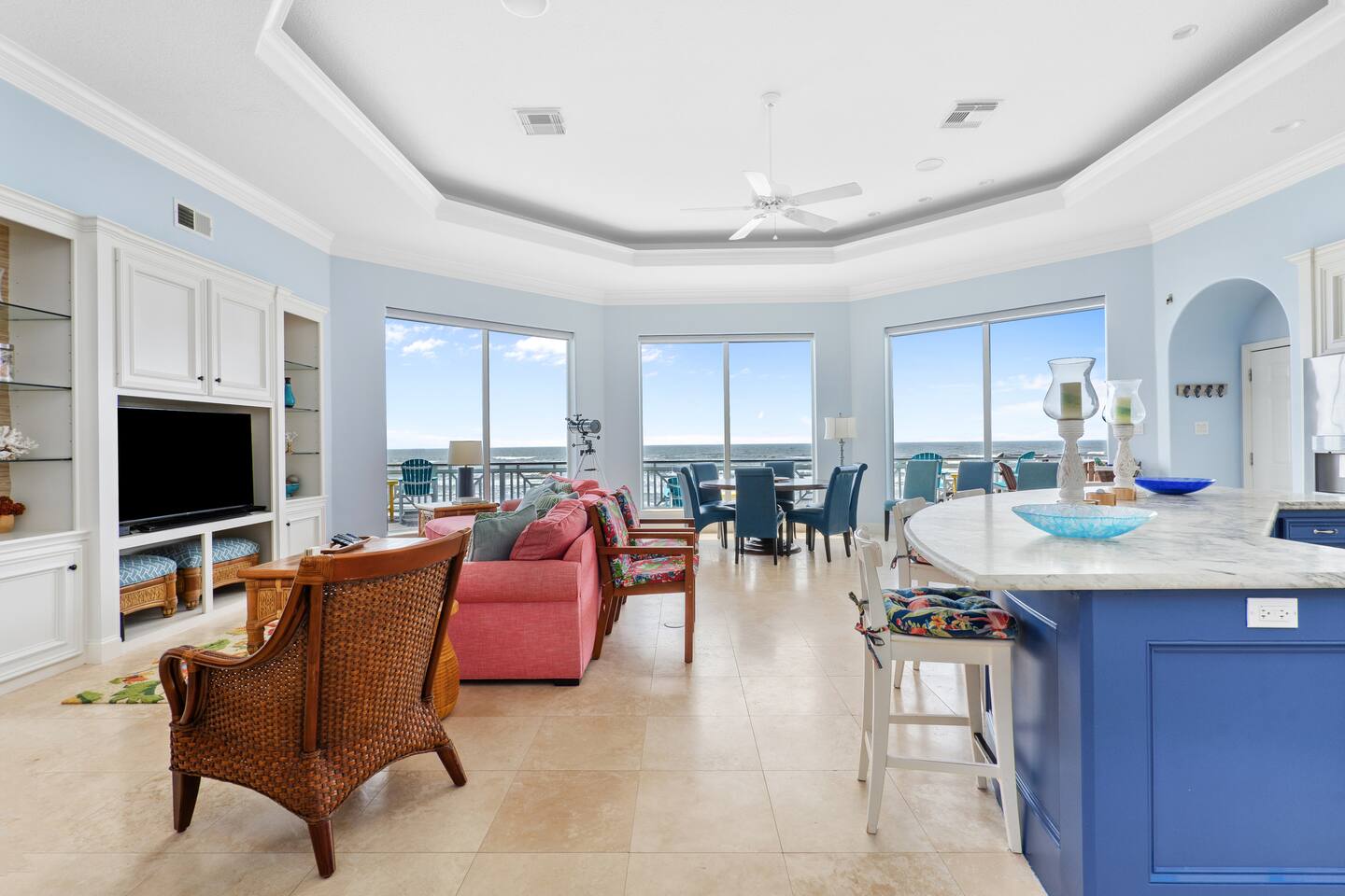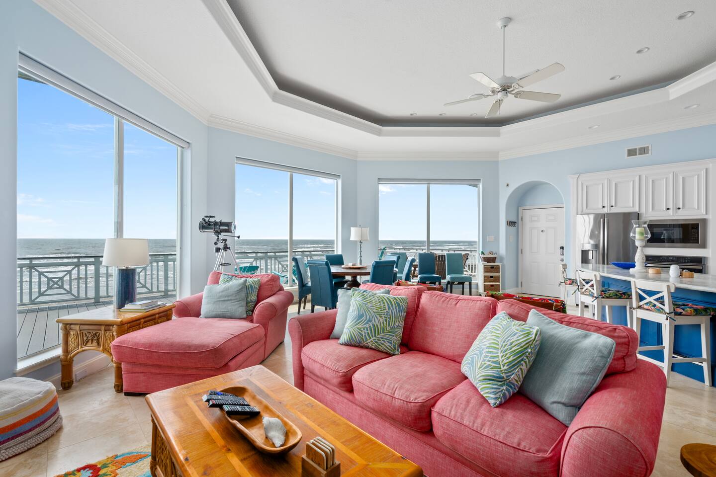 Experience the magic of oceanfront living in our bright and airy beach house. The home is designed for relaxation and connection, featuring: * An open-concept living area with floor-to-ceiling windows that frame stunning, panoramic ocean views and fill the space with natural light. * A comfortable living room with a TV and sound system for unwinding after a day in the sun. * A large, well-appointed kitchen perfect for preparing delicious group meals. * Multiple unique bedrooms and several clean bathrooms for your group's comfort. Two of the bedrooms offer their own beautiful views of the water. * Convenient on-site washer and dryer. * A coffee maker to start your mornings right.
